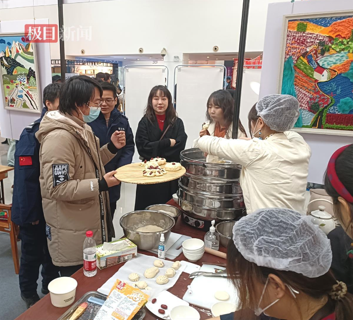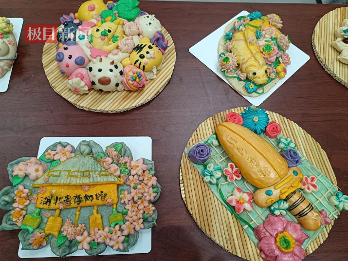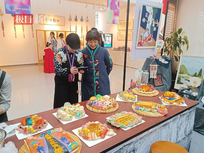 “热气腾腾的枣馍新鲜出炉啦!欢迎大家前来品尝。”湖北幼儿师范高等专科学校的“剪刀·馒头·布”创意工作坊以鄂西北地区民间传统技艺花馍制作和非遗技艺拼布为主要展示。“面粉加入食用色素、酵母,揉捏成面团儿,醒发之后用剪刀、梳子、顶针、筷子等工具,通过切、揉、捏、揪、搓、按等方法制作而成。”该工坊花馍技艺的指导老师李天虎边比画边介绍道。手指翻转之间,一个个生动的造型跃然案上,越王勾践剑、十二生肖、醒狮项圈……各式各样的花馍吸引了很多现场观众的目光。